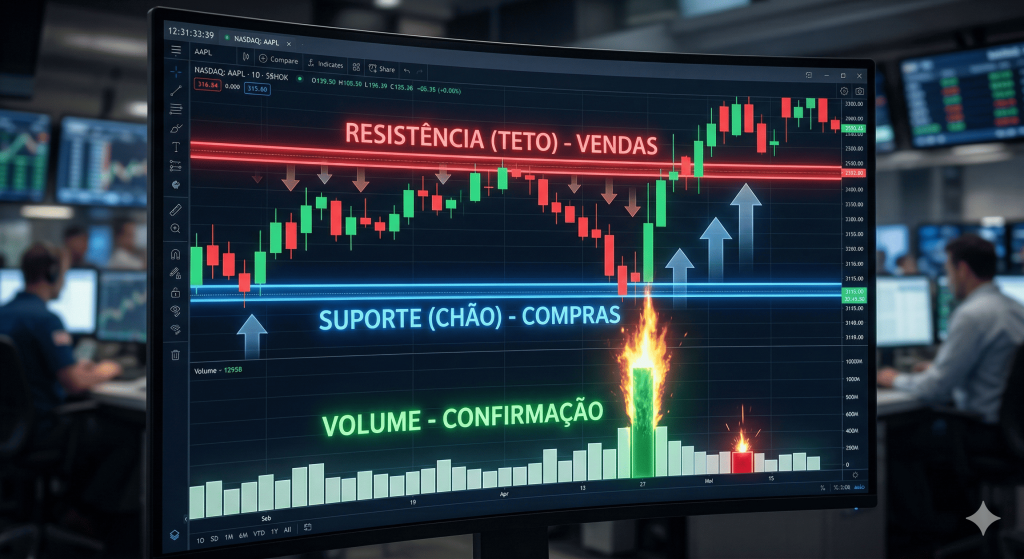 - Suporte (O Chão): Região onde os compradores aparecem com força, impedindo o preço de cair mais.